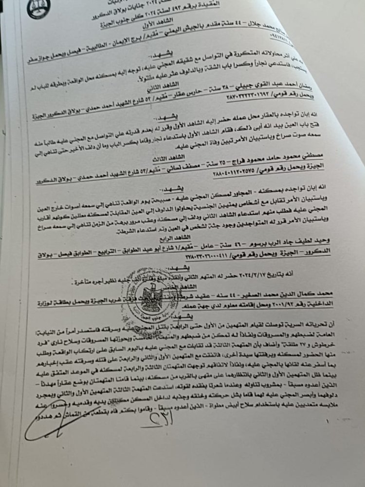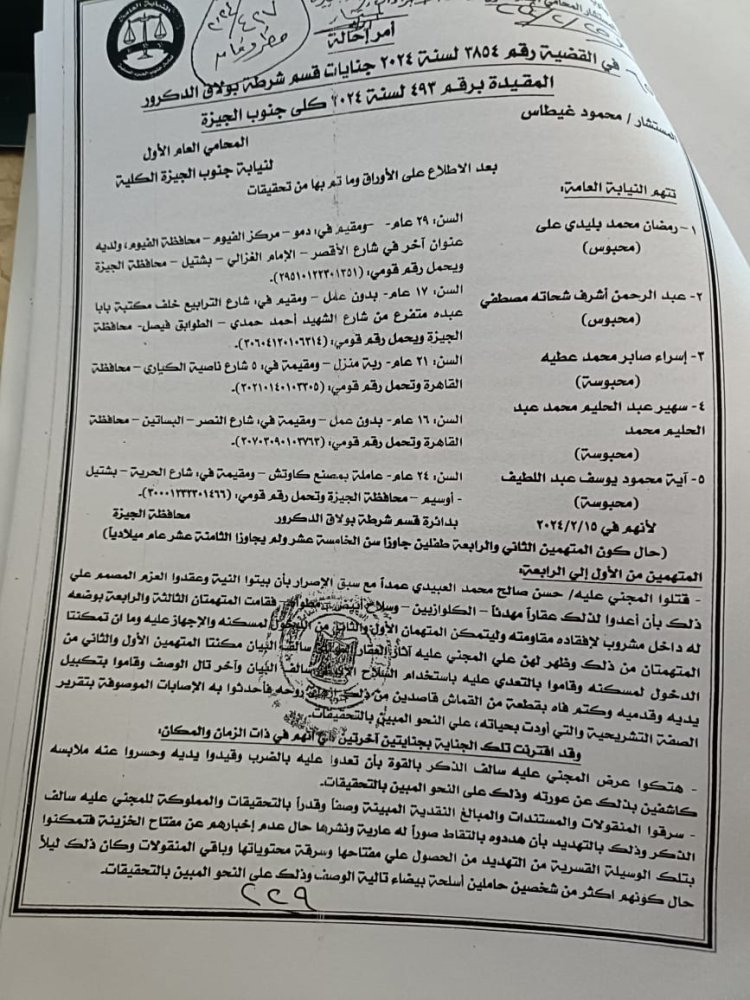 وأسفرت التحريات وجمع المعلومات عن تحديد مرتكبي الواقعة وهم كل من رمضان محمد 29سنة، سائق ومقيم المنيرة الغربية بالجيزة، سبق اتهامه في العديد من القضايا أبرزها قتل وسلاح دون ترخيص وسرقة وإتلاف عمد، وعبدالرحمن أشرف شحاتة مصطفى وشهرته عبده عسلية سن 19 خراط ومقيم الطوابق بالجيزة، وإسراء صابر محمد عطية وشهرتها دينا سن 22 ربة منزل ومقيمة منشأة ناصر بالقاهرة، وسهير عبدالحليم محمد عبدالحليم وشهرتها منة سن 17، ربة منزل ومقيمة منشأة ناصر بالقاهرة.