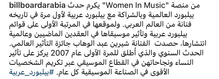 حصدت النجمة شيرين عبدالوهاب على جائزة التأثير العالمي، من منصة بيلبورد العالمية، لتصبح أول مطربة في الوطن العربي تحصل على هذه الجائزة، وذلك ضمن فعالية تحت عنوان «Women In Music» التي أنطلقت للمرة الأولى عام 2007 وتركزعلى تأثير النساء ونجاحاتهن في القطاع الموسيقي عبر تكريم الشخصيات الأقوى في الصناعة الموسيقية كل عام.