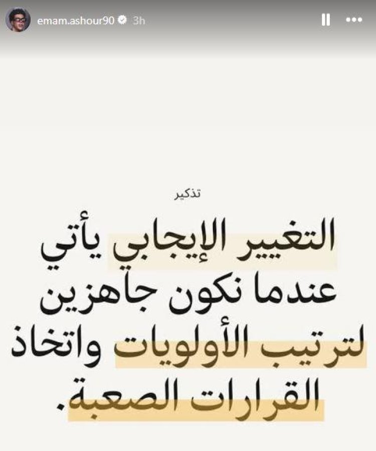 وكتب إمام عاشور في رسالته: "التغيير الإيجابي يأتي عندما نكون جاهزين لترتيب الأولويات، واتخاذ القرارات الصعبة".