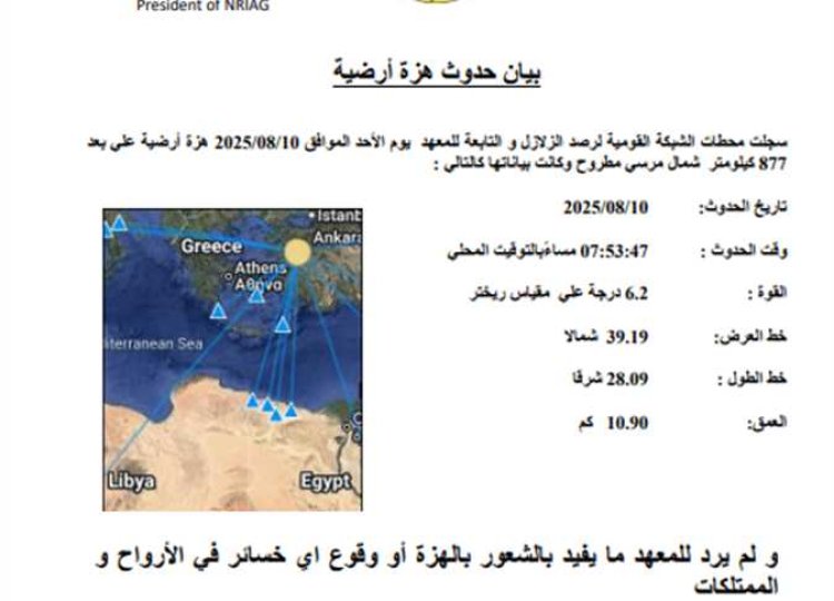 البحوث الفلكية: زلزال بقوة 6.2 ريختر يضرب مرسى مطروح