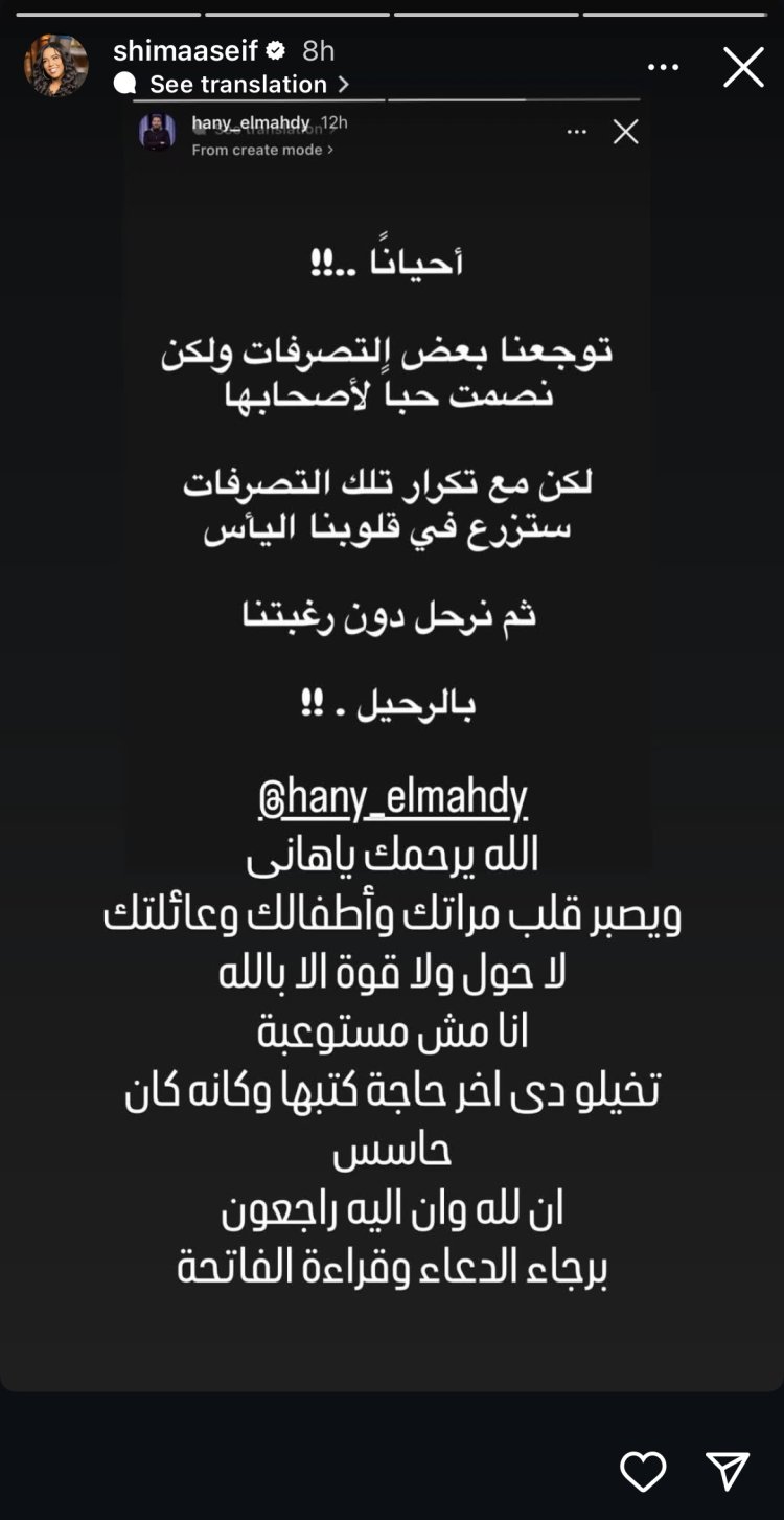 نعت الفنانة شيماء سيف المخرج الراحل هاني المهدي، الذي وافته المنية أمس، معربة عن صدمتها وحزنها الشديد لفقدانه.