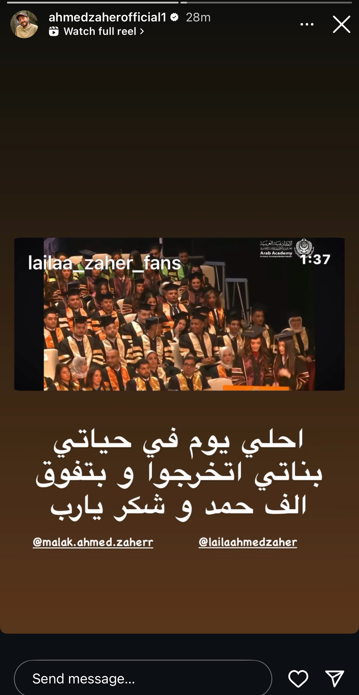 ونشر زاهر عبر حسابه الرسمي على "إنستجرام" مقطع فيديو من أجواء حفل التخرج، وعلّق عليه بكلمات مؤثرة قائلاً:"أحلى يوم في حياتي، بناتي اتخرجوا وبتفوق... ألف حمد وشكر يارب."
