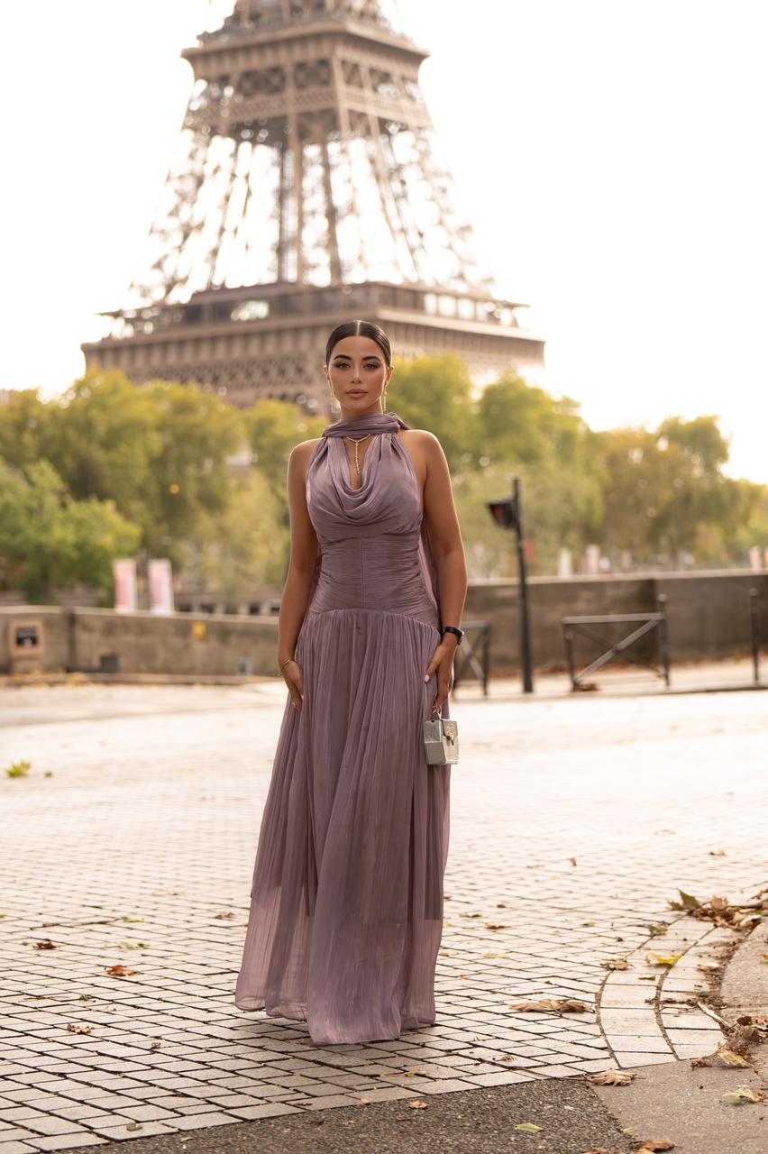 حضرت الفنانة يارا السكري إحدى عروض الأزياء بفستان ملكي باللون الخزامى، تميز بتصميم ناعم يجمع بين الأنوثة والفخامة، مقدمة مزيجًا من الجمال العربي والأناقة العالمية.