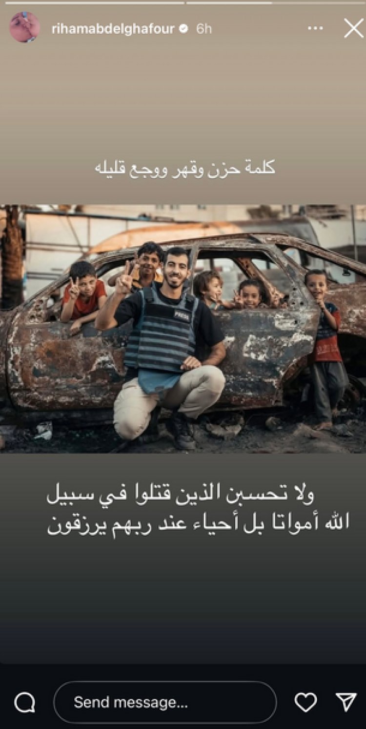 عبرت الفنانة ريهام عبد الغفور عن حزنها العميق عقب استشهاد الصحفي الفلسطيني صالح الجعفراوي، الذي قُتل أثناء تأدية واجبه المهني في تغطية الأحداث الجارية في غزة.