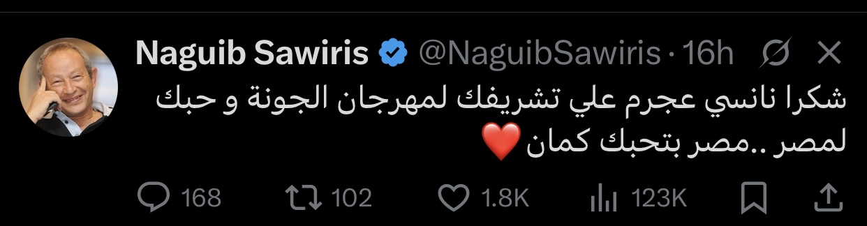 وكتب ساويرس عبر حسابه الشخصي على موقع إكس:"شكرًا نانسي عجرم على تشريفك لمهرجان الجونة وحبك لمصر، مصر بتحبك كمان".