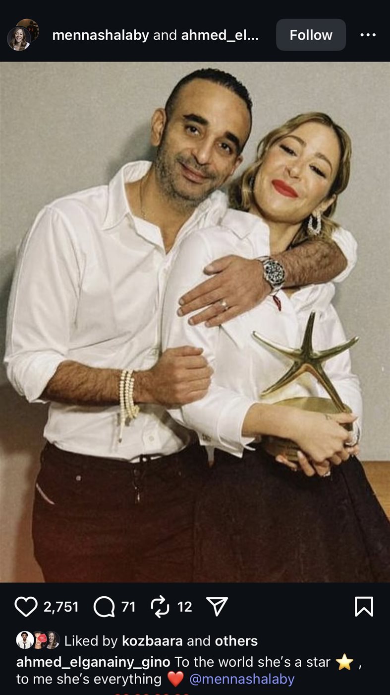 أحمد الجنايني يغازل زوجته منة شلبي: «بالنسبة للعالم نجمة.. وبالنسبة لي كل شيء» وهي ترد: «بحبك»
