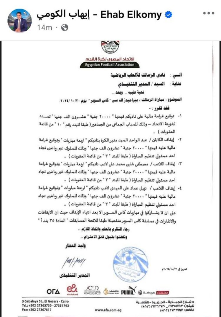 وكان إيهاب الكومي عضو اتحاد الكرة السابق قد نشر خطاب رسمي من اتحاد الكرة السابق بإيقاف نبيل عماد دونجا لمدة 4 مباريات في كأس السوبر المصري بسبب مشاجرته مع مسؤولي تنظيم البطولة في الإمارات العام الماضي، باعتباره ينطبق على النسخة الجديدة من السوبر.