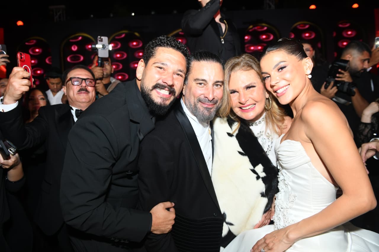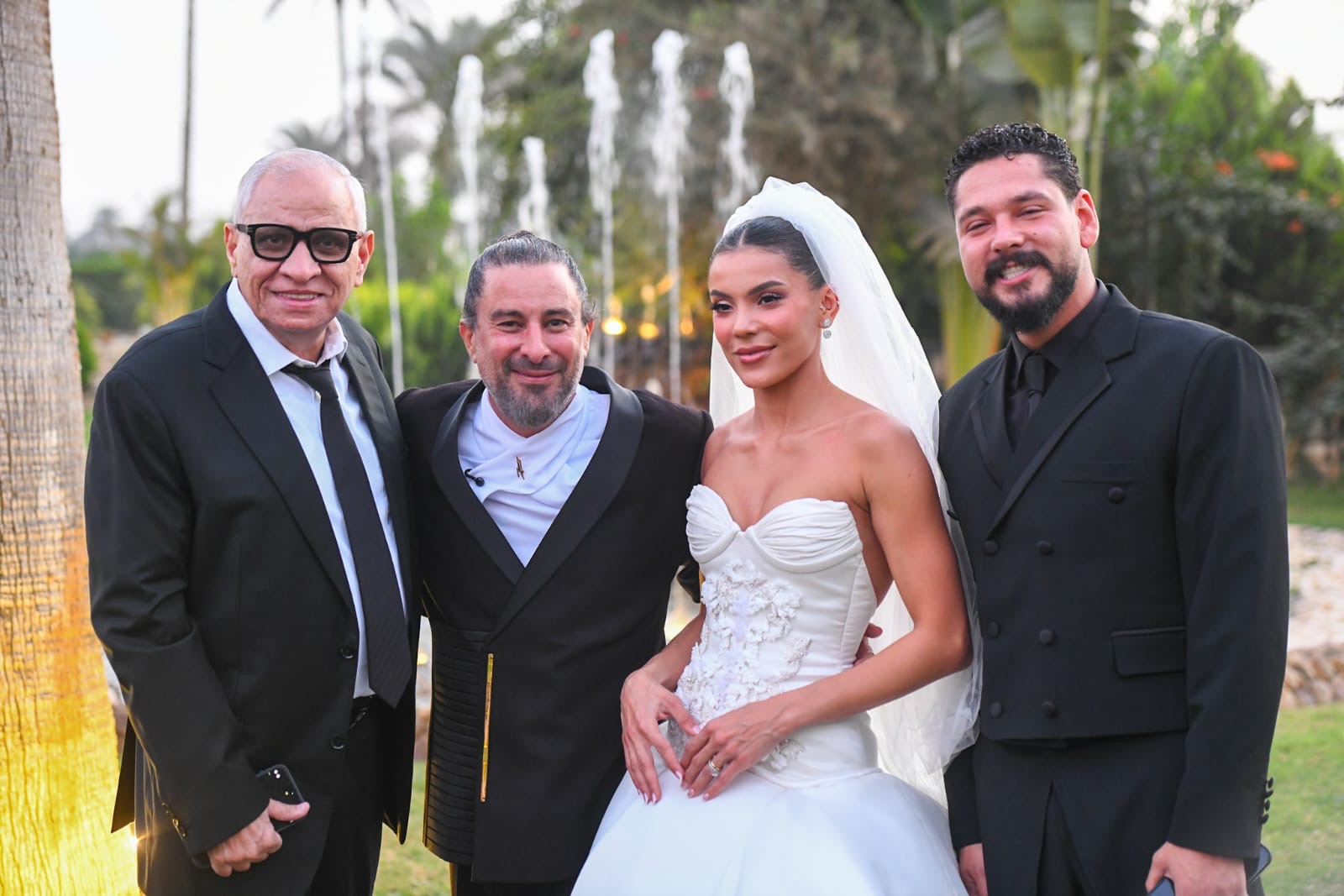 أما العريس هادي الباجوري فاختار الظهور بإطلالة رسمية أنيقة، مرتديًا بدلة سوداء كلاسيكية وقميصًا أبيض دون ربطة عنق، في تناغم مثالي مع إطلالة عروسه.