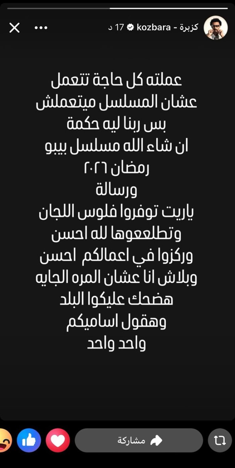 حيث قال كزبرة في منشوره: "عملته كل حاجة تتعمل عشان المسلسل ميتعملش، بس ربنا ليه حكمة أنه يتعمل، إن شاء الله مسلسل بيبو رمضان 2026، ورسالة ياريت توفروا فلوس اللجان وتطلعوها لله أحسن، وركزوا في أعمالكم أحسن، وبلاش أنا عشان المرة الجاية هضحك عليكم البلد، وهقول أساميكم واحد واحد".