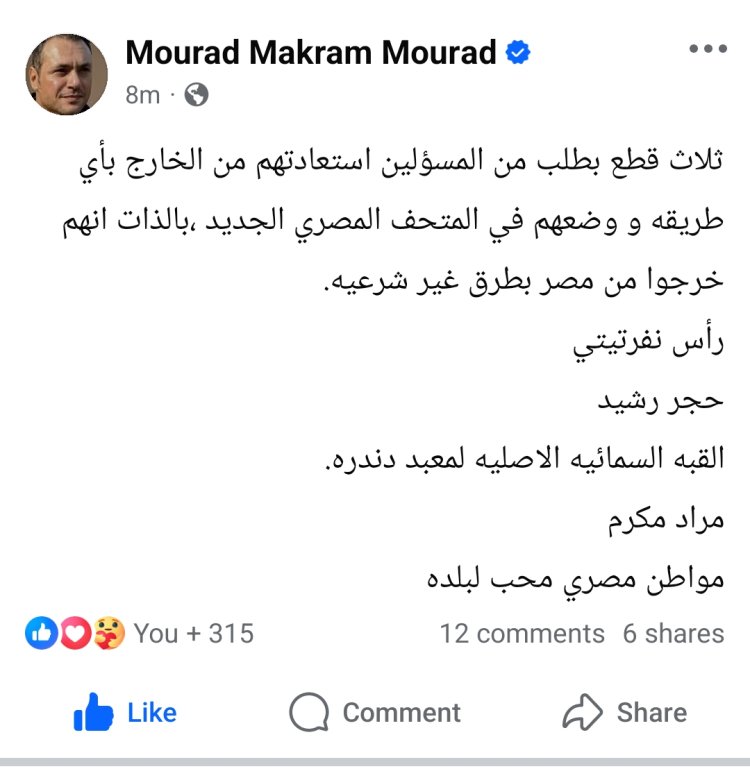 وقال “مكرم” في منشوره: “ثلاث قطع بطلب من المسؤولين استعادتهم من الخارج بأي طريقة، بالذات إنهم خرجوا من مصر بطرق غير شرعية رأس نفرتيتي، حجر رشيد، القبة السماوية الأصلية لمعبد دندرة. مراد مكرم.. مواطن مصري محب لبلده".