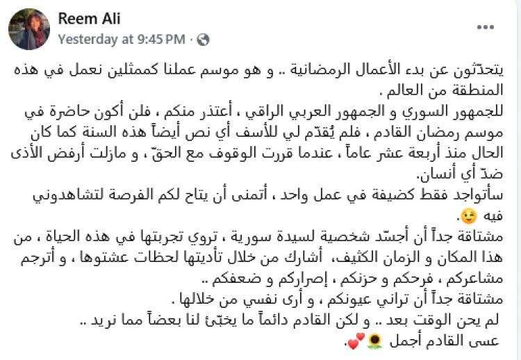 وقالت في منشور لها عبر عبر فيسبوك: "يتحدّثون عن بدء الأعمال الرمضانية.. وهو موسم عملنا كممثلين نعمل في هذه المنطقة من العالم .. للجمهور السوري و الجمهور العربي الراقي، أعتذر منكم، فلن أكون حاضرة في موسم رمضان القادم، فلم يُقدّم لي للأسف أي نص أيضاً هذه السنة كما كان الحال منذ أربعة عشر عاماً، عندما قررت الوقوف مع الحقّ، ومازلت أرفض الأذى ضدّ أي أنسان".