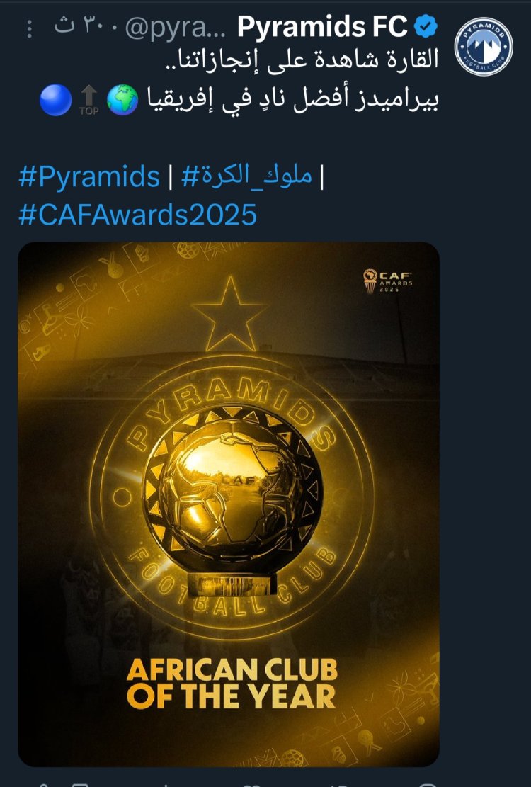 حصد بيراميدز جائزة أفضل ناد في إفريقيا 2025 وذلك خلال حفل الاتحاد الأفريقي لكرة القدم "كاف" لتوزيع جوائز الأفضل لهذا العام ولتكريم اللاعبين والمدربين الأفارقة الذين تميّزوا بأداءٍ مميزٍ مع أنديتهم ومنتخباتهم، بالإضافة إلى تكريم الأندية والمنتخبات الوطنية التي شهدت عامًا استثنائيًا.