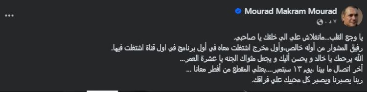 عبّر الفنان مراد مكرم عن حزنه العميق لوفاة الإعلامي خالد شبانة، رئيس قطاع القنوات المتخصصة بالتليفزيون، الذي توفي يوم الأربعاء، من خلال رسالة مؤثرة نشرها عبر حسابه على فيسبوك.