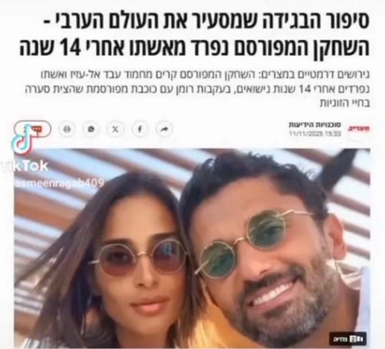 اهتمت وسائل إعلام إسرائيلية بخبر طلاق الفنان كريم محمود عبد العزيز عن زوجته آن، مشيرة إلى شائعات متداولة حول ارتباطه بفنانة أخرى.