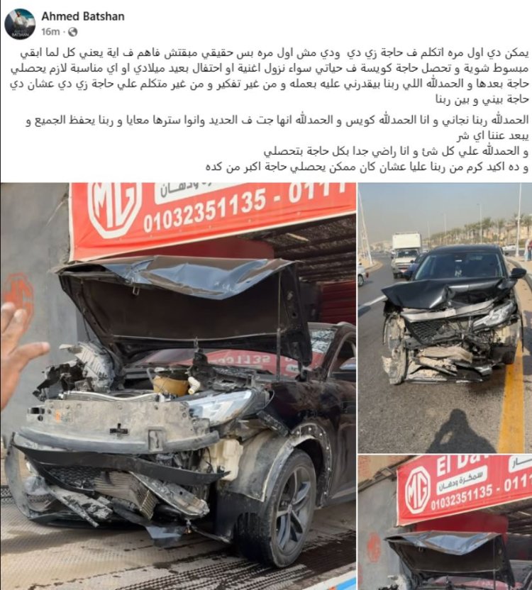 ونشر بتشان مجموعة من الصور التي تظهر الأضرار التي لحقت بسيارته، معلقًا بقوله: «يمكن دي أول مرة أتكلم في موضوع زي ده، ودي مش أول حادثة، بس بجد مبقتش فاهم… كل ما أبدأ أكون مبسوط أو يحصل شيء كويس في حياتي.. سواء نزول أغنية أو الاحتفال بعيد ميلادي أو أي مناسبة.. لازم يحصللي بعدها حاجة.. الحمدلله على كل اللي ربنا بيقدره، وبعمل اللي أقدر عليه من غير ما أتكلم لأن الحاجات دي بيني وبين ربنا».