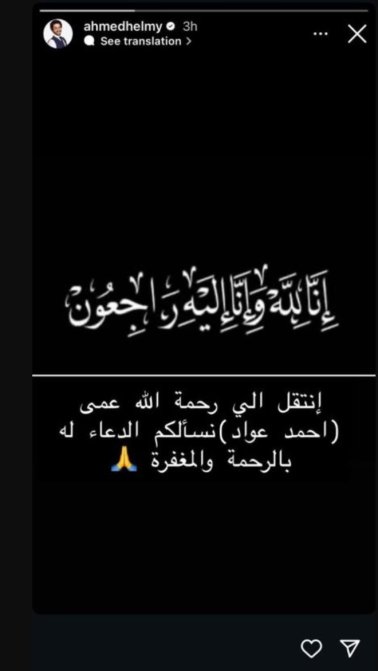 الموت يفجع أحمد حلمي في وفاة عمه.. وشقيقته تكشف موعد العزاء