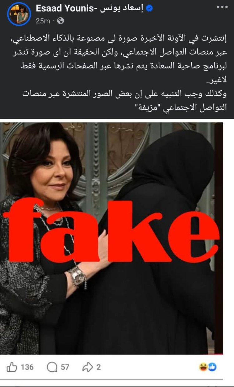 وكتبت: "إنتشرت في الآونة الأخيرة صورة لى مصنوعة بالذكاء الاصطناعي، عبر منصات التواصل الاجتماعي، ولكن الحقيقة ان اى صورة تنشر لبرنامج صاحبة السعادة يتم نشرها عبر الصفحات الرسمية فقط لاغير.. وكذلك وجب التنبيه على إن بعض الصور المنتشرة عبر منصات التواصل الاجتماعي "مزيفة".