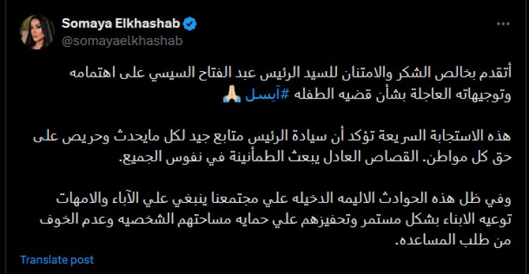 وقالت الخشاب في تغريدة لها عبر حسابها على إكس: "أتقدم بخالص الشكر والامتنان للسيد الرئيس عبد الفتاح السيسي على اهتمامه وتوجيهاته العاجلة بشأن قضيه الطفله آيسل"