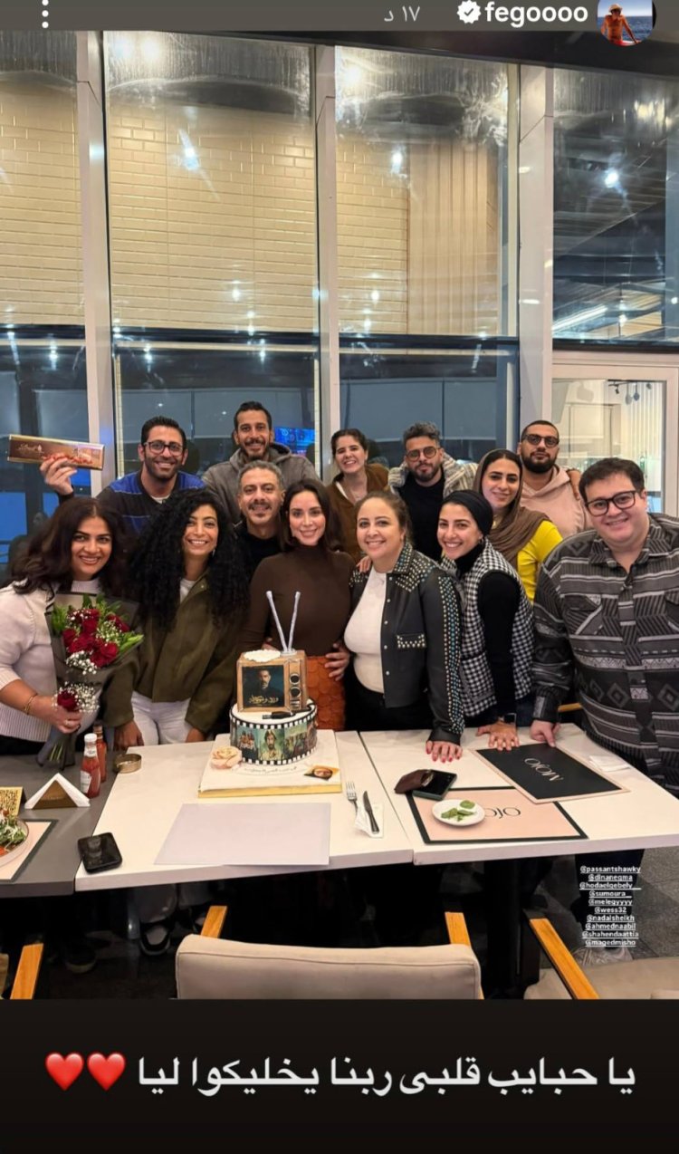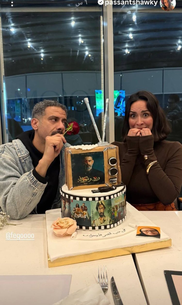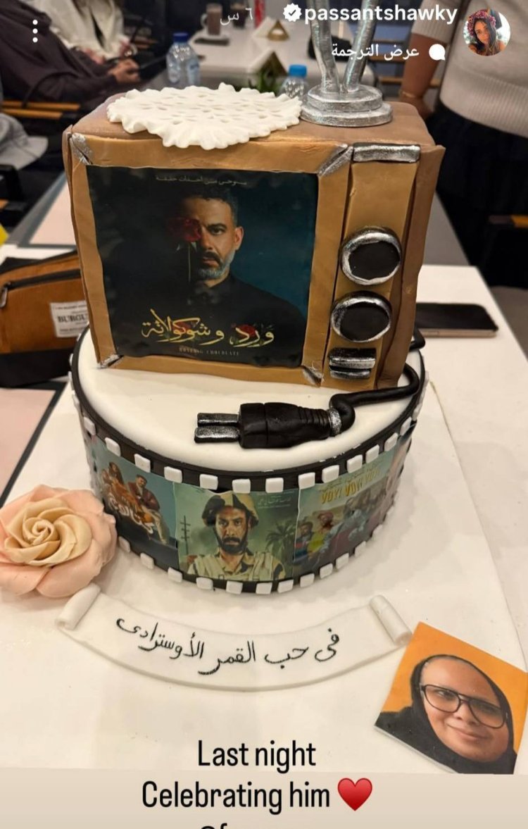 بسنت شوقي تحتفل بنجاح "ورد وشوكولاتة" بتورتة تحمل صورة والدة شيماء جمال