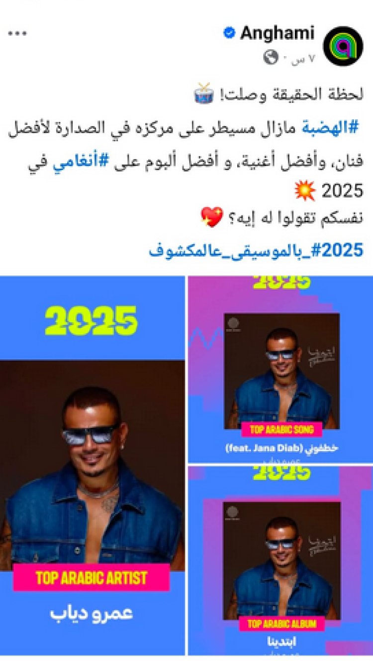 أعلنت منصة "أنغامي" نتائج عام 2025، وجاءت كلها في صالح عمرو دياب، الذي واصل تثبيت هيمنته على الساحة الموسيقية العربية بوصفه الأكثر استماعًا في تاريخ المنصة.