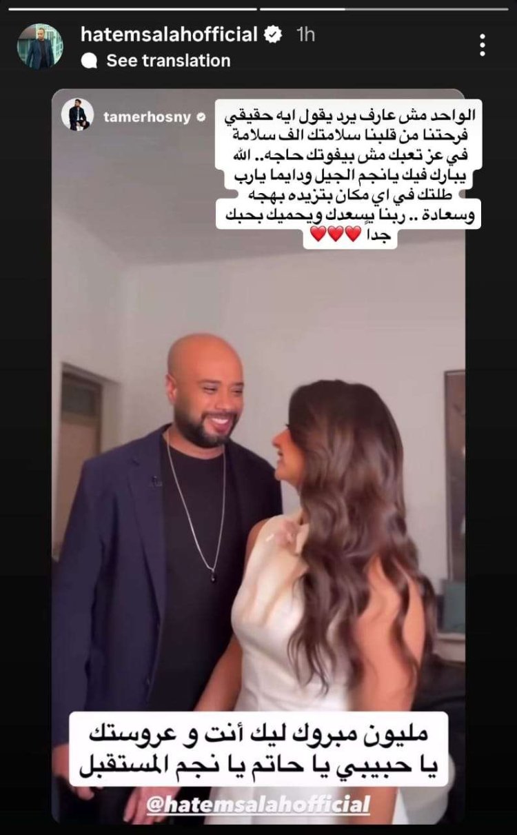 كتب تامر حسني، من خلال خاصية القصة القصيرة "ستوري" عبر حسابه الرسمي على "إنستجرام": "مليون مبروك ليك أنت وعروستك يا حبيبي يا حاتم يا نجم المستقبل".