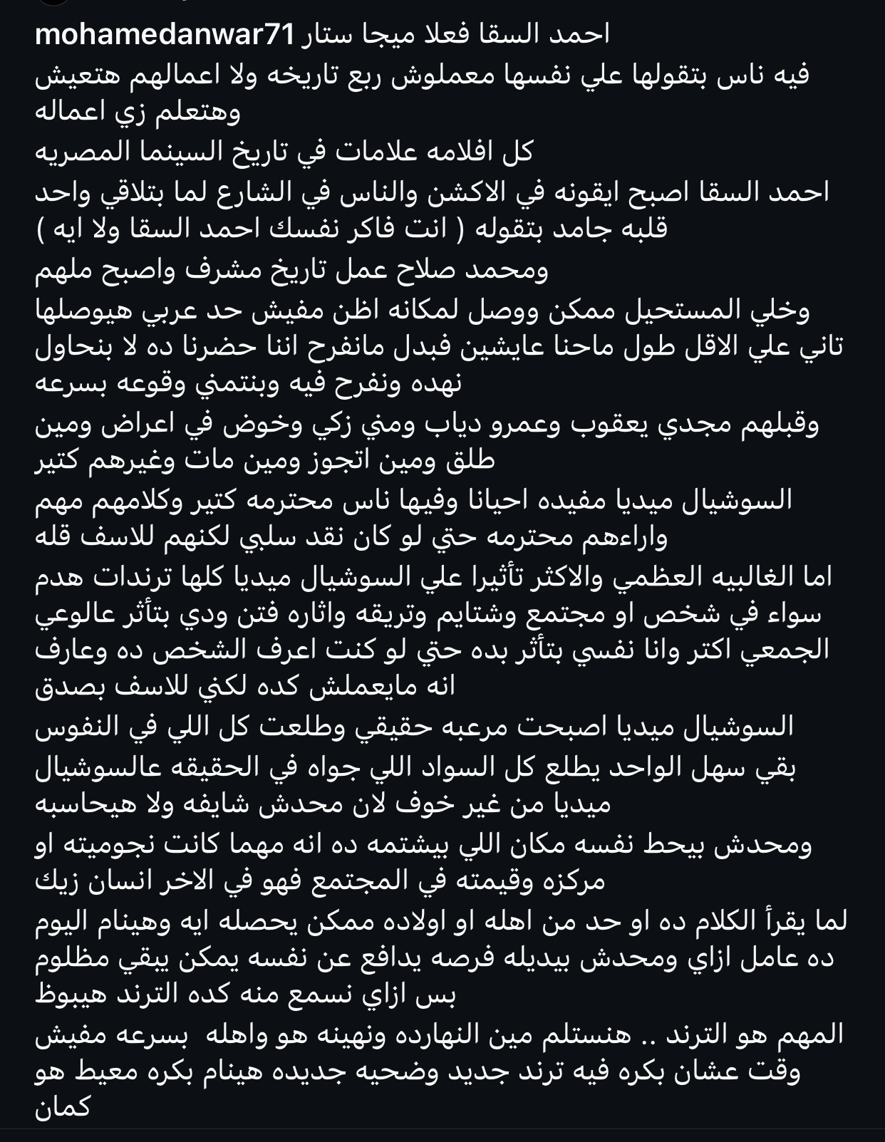 كما أشار إلى عدد من الرموز المصرية والعربية التي صنعت تاريخًا مشرفًا في مجالات مختلفة، مؤكدًا أن السوشيال ميديا باتت ساحة للجدل والخوض في الخصوصيات بدلًا من تقدير النجاحات والإنجازات.