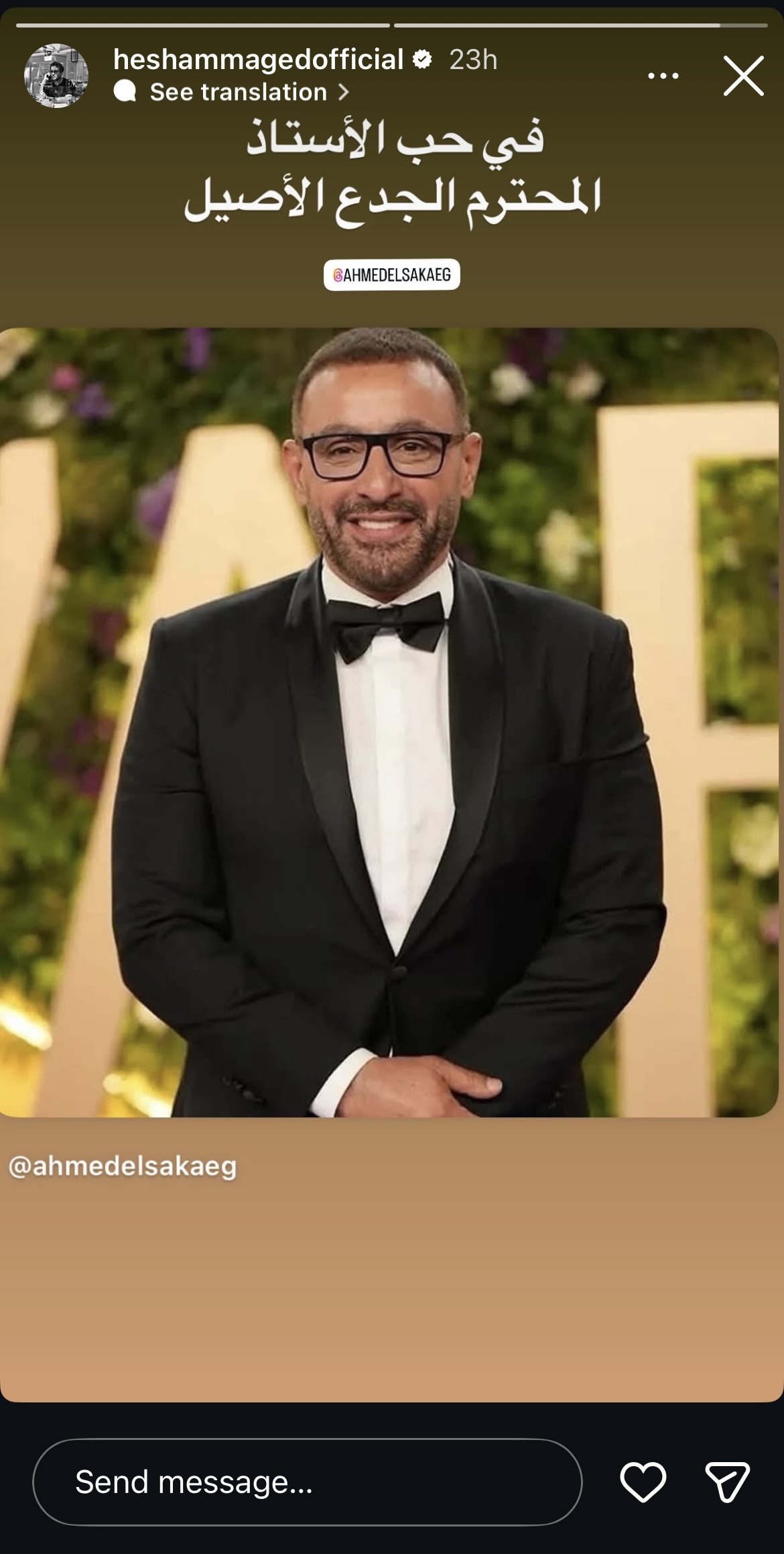 ونشر هشام ماجد عبر خاصية «ستوري» على حسابه الرسمي بموقع إنستجرام رسالة مقتضبة قال فيها: «في حب الأستاذ المحترم الجدع الأصيل»، في إشارة إلى تضامنه الكامل مع أحمد السقا ودعمه له في مواجهة الهجوم الذي طالَه مؤخرًا.