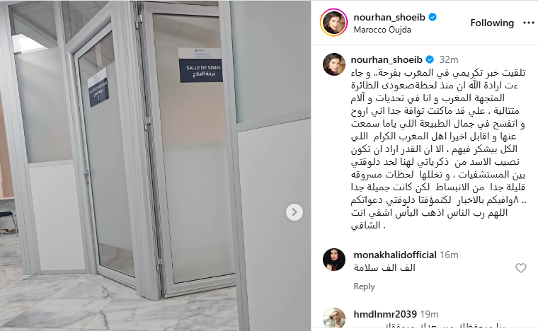وكتبت نورهان منشورًا عبر حسابها الشخصي على موقع تبادل الصور والفيديوهات «إنستجرام»، أوضحت فيه تفاصيل ما مرت به، قائلة إنها تلقت خبر تكريمها في المغرب بفرحة كبيرة، إلا أن إرادة الله شاءت أن تبدأ معاناتها الصحية منذ لحظة صعودها إلى الطائرة المتجهة إلى المغرب، حيث تعرضت لآلام وتحديات متتالية، رغم شغفها الشديد بزيارة المغرب والاستمتاع بطبيعته الخلابة التي طالما سمعت عنها.