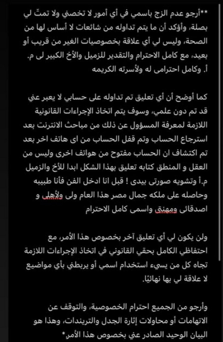 وأضافت: "كما أوضح أن أي تعليق تم تداوله على حسابي لا يعبر عني قد تم دون علمي، وسوف يتم اتخاذ الإجراءات القانونية اللازمة لمعرفة المسؤول عن ذلك من مباحث الانترنت بعد استرجاع الحساب وتم قفل الحساب من أي هاتف آخر بعد تم اكتشاف أن الحساب مفتوح من هواتف أخرى وليس من العقل والمنطق كتابه تعليق بهذا الشكل أبدا للأخ والزميل م.أ وتشويه صورتي بیدي! قبل أن ادخل الفن فأنا طبيبة وحاصلة على ملكة جمال مصر هذا العام ولي والأهلي اصدقائي ومهنتي واسمي كامل الاحترام