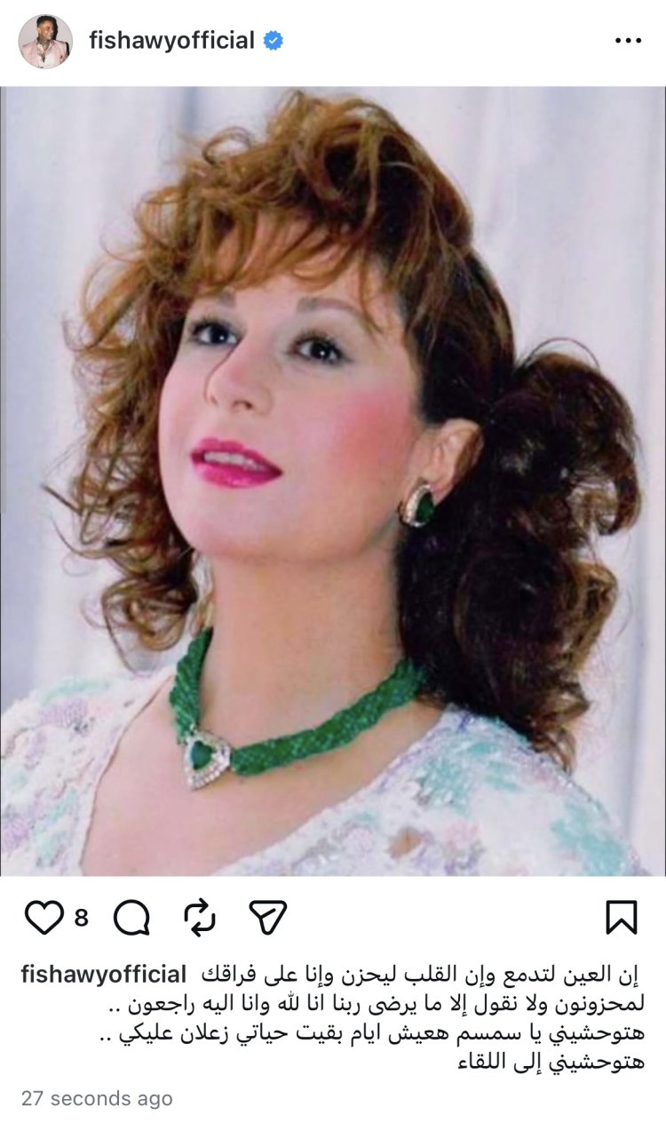 وكتب الفيشاوي، عبر حسابه الرسمي على موقع التواصل الاجتماعي انستجرام: "إن العين لتدمع وإن القلب ليحزن وإنا على فراقك لمحزونون ولا نقول الإ ما يرضى ربنا إنا لله وإنا إليه راجعون".