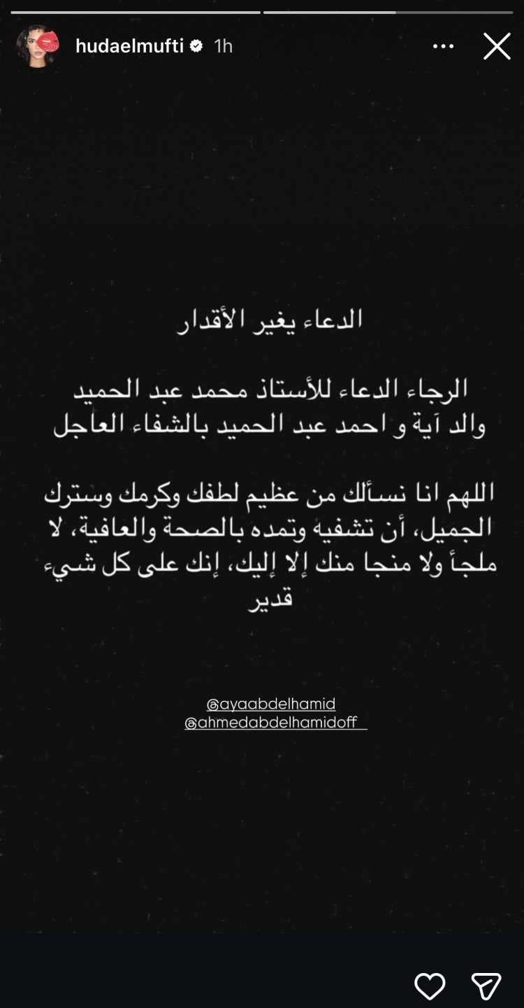 وكتبت هدى المفتي عبر ستوري انستجرام: "الدعاء يغير الأقدار الرجاء الدعاء للاستاذ محمد عبد الحميد والد آية وأحمد عبد الحميد بالشفاء العاجل".