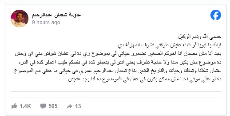 وكتب نجل شعبان عبدالرحيم عبر حسابه الشخصي على فيسبوك: "حسبي الله ونعم الوكيل.. فينك يا أبويا لو أنت عايش دلوقتي تشوف المهزلة دي.. بجد أنا مش مصدق.. أنا أخوكم الصغير تدمروا حياتي ليه ؟.. بموضوع زي ده ليه.. علشان شوفتوا مني إيه وحش ؟".