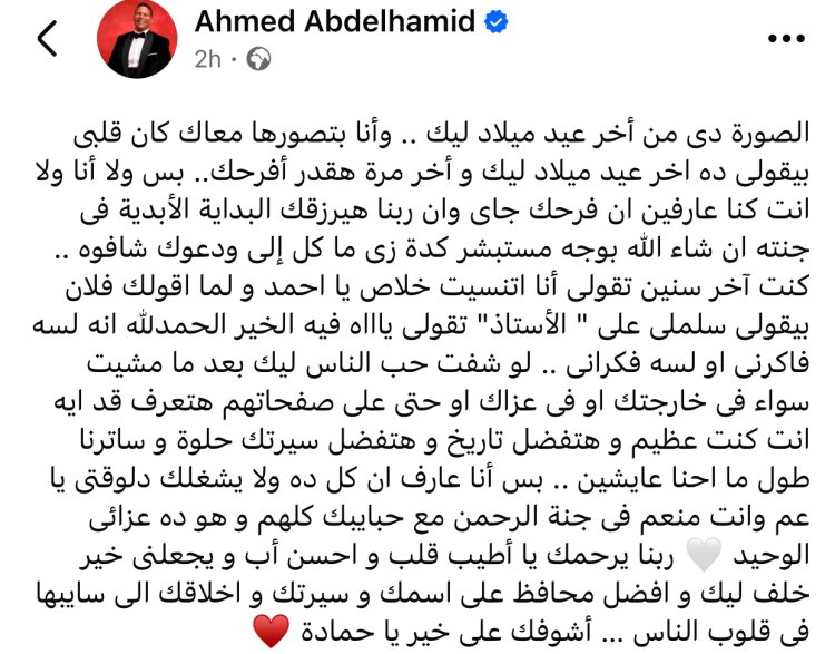 وأرفق عبدالحميد الصورة برسالة مؤثرة، كشف خلالها أنها التُقطت في آخر عيد ميلاد لوالده، مؤكدًا أنه شعر حينها بأنها اللحظة الأخيرة التي سيشاركه فيها الاحتفال، دون أن يدرك أن الله كان يعد له بداية أبدية في جنته.