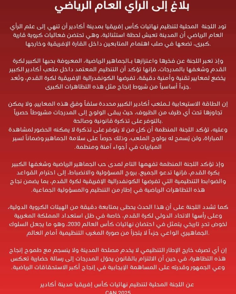 وختمت اللجنة بيانها بالتأكيد على أن أي تصرف خارج الإطار التنظيمي لا يخدم مصلحة المدينة ولا ينسجم مع طموح إنجاح هذه التظاهرة القارية، في حين أن الالتزام بالقانون يحول المدرجات إلى رسالة حضارية تعكس وعي الجمهور ودوره الإيجابي في إنجاح أكبر الاستحقاقات الرياضية.