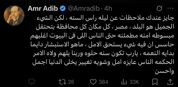 وكتب عمرو أديب عبر حسابه الرسمي على منصة «إكس» أن رغم وجود بعض الملاحظات على ليلة رأس السنة، فإن الصورة الأجمل كانت في مصر نفسها، حيث شهدت جميع المحافظات أجواء احتفالية مبهجة يسودها الإحساس بالأمن والاستقرار، مشيرًا إلى أن حتى من لم يشاركوا في الاحتفالات خارج منازلهم شعروا بوجود ما يدعو إلى الأمل.