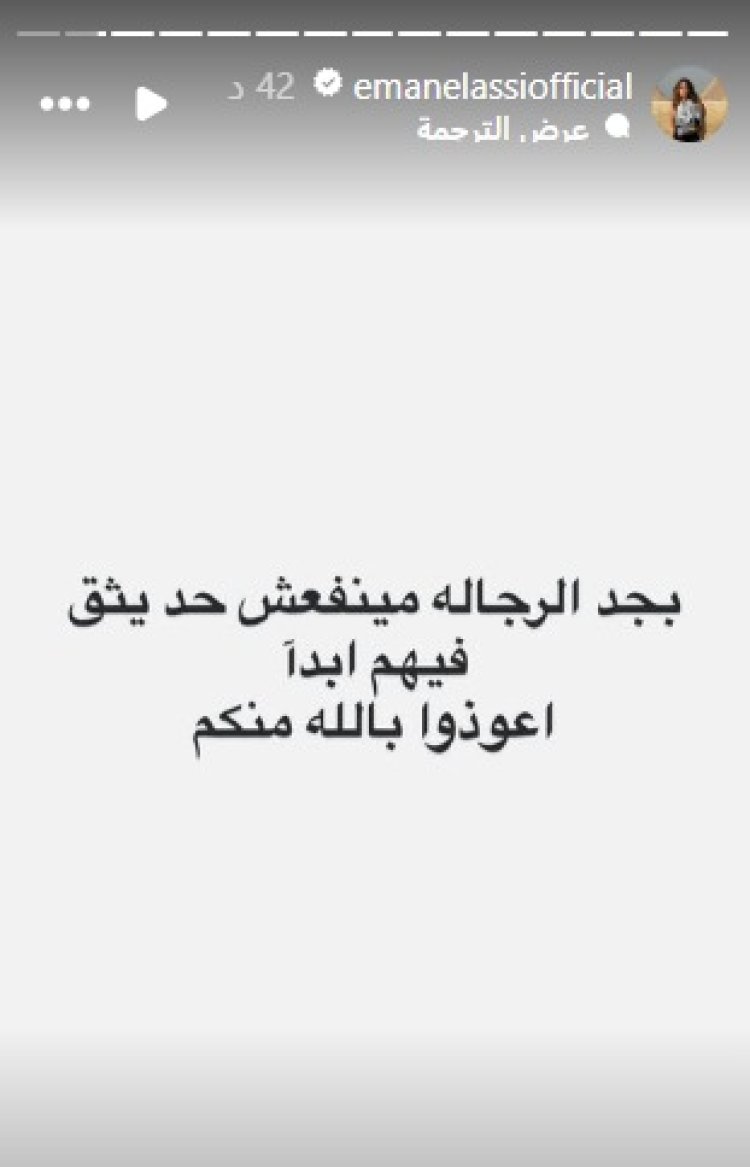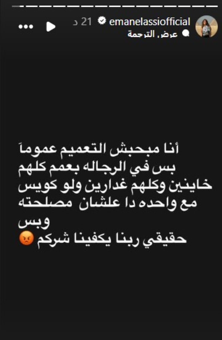 وقالت إيمان العاصي عبر خاصية "ستوري" بحسابها على موقع "إنستجرام": "بجد الرجالة ماينفعش حد يثق فيهم أبداً، أعوذ بالله منكم.. أنا مبحبش التعميم.. بس في الرجالة بعمم.. كلهم خاينين وغدارين.. ولو راجل كويس مع واحدة؛ دا علشان مصلحته وبس.. حقيقي ربنا يكفينا شرهم".