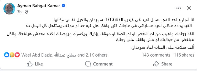 عبر الشاعر والمؤلف أيمن بهجت قمر عن تأثره الشديد بأزمة ومرض الفنانة لقاء سويدان، التي أصيبت بمرض "شلل بيل" أو "العصب السابع"، بسبب تعرضها لضغوطات نفسية أثرت عليها وأدخلتها في حالة حزن شديد، وهو ما أكدته من خلال ظهورها الصادم في برنامجها التلفزيوني.