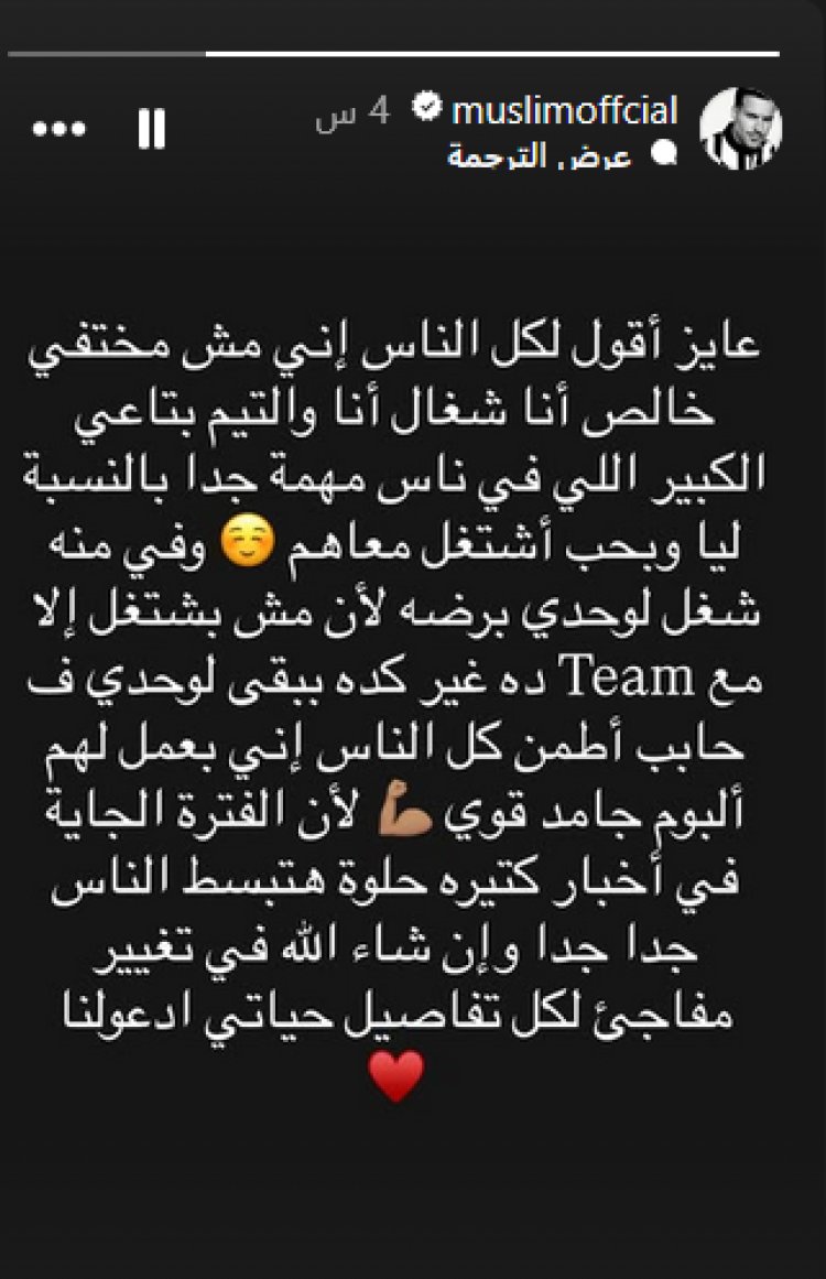 وأوضح مسلم لجمهوره: "عايز أقول لكل الناس إني مش مختفي خالص، أنا شغال أنا والتيم بتاعي الكبير اللي في ناس مهمة جدًا بالنسبة ليا وبحب أشتغل معاهم، وفي منه شغل لوحدي برضه لأن مش بشتغل إلا مع التيم ده، غير كده يبقى لوحدي".