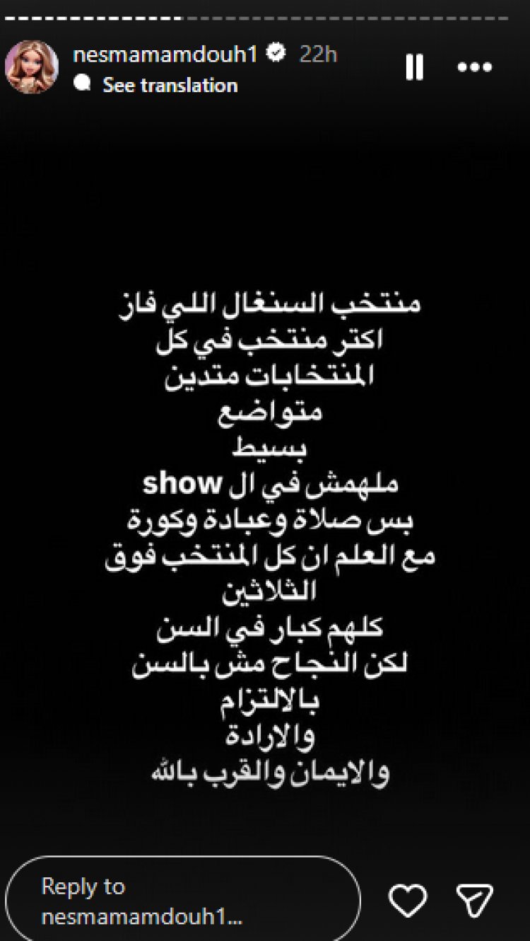 وعلقت على فوز المنتخب السنغالي، قائلة: "منتخب السنغال اللي فاز أكتر منتخب من كل المنتخبات متدين ومتواضع ملهمش في الـShow، بس صلاة وعبادة وكورة مع العلم إن كل المنتخب فوق الثلاثين كلهم كبار في السن لكن النجاح مش بالسن بالالتزام والإرادة والإيمان والقرب من الله".