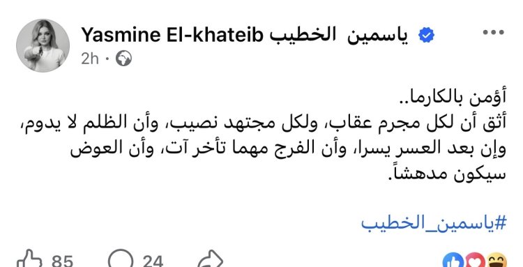 وكتبت ياسمين الخطيب عبر حسابها الرسمي: «أثق أن لكل مجرم عقابًا، ولكل مجتهد نصيبًا، وأن الظلم لا يدوم، وأن بعد العسر يسرًا، وأن الفرج مهما تأخر آتٍ، وأن العوض سيكون مدهشًا».