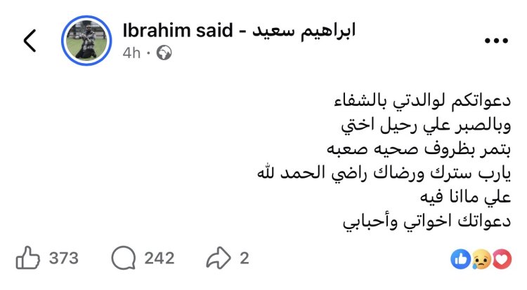 وكتب إبراهيم سعيد عبر حسابه الشخصي على موقع «فيسبوك»: «دعواتكم لوالدتي بالشفاء وبالصبر على رحيل أختي، بتمر بظروف صحية صعبة، يارب سترك ورضاك، راضي الحمد لله على ما أنا فيه، دعواتكم إخواتي وأحبابي».