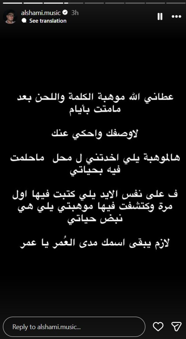 وقال الشامي إن الله منحه موهبة الكلمة واللحن بعد أيام قليلة من وفاة شقيقه، مضيفًا أنه لم يتمكن من وصف مشاعره أو الحديث عن شقيقه كما يريد، وأن هذه الموهبة الغالية قادته إلى مكان لم يكن يحلم بالوصول إليه في حياته العملية والفنية، معتبرًا أن تجربة فقدانه لشقيقه كانت نقطة تحول في حياته.