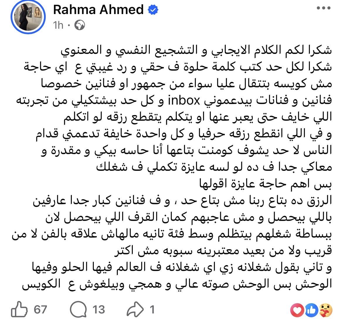 ونشرت رحمة أحمد منشورًا عبر حسابها الشخصي على موقع «فيسبوك»، عبّرت فيه عن امتنانها للكلمات الإيجابية التي وصلتها، قائلة إنها تشكر كل من دافع عنها وردّ غيبتها، سواء من الجمهور أو الفنانين، خاصة أولئك الذين يساندونها بشكل خاص بعيدًا عن العلن، خوفًا من التعرض لأذى أو فقدان فرص العمل.