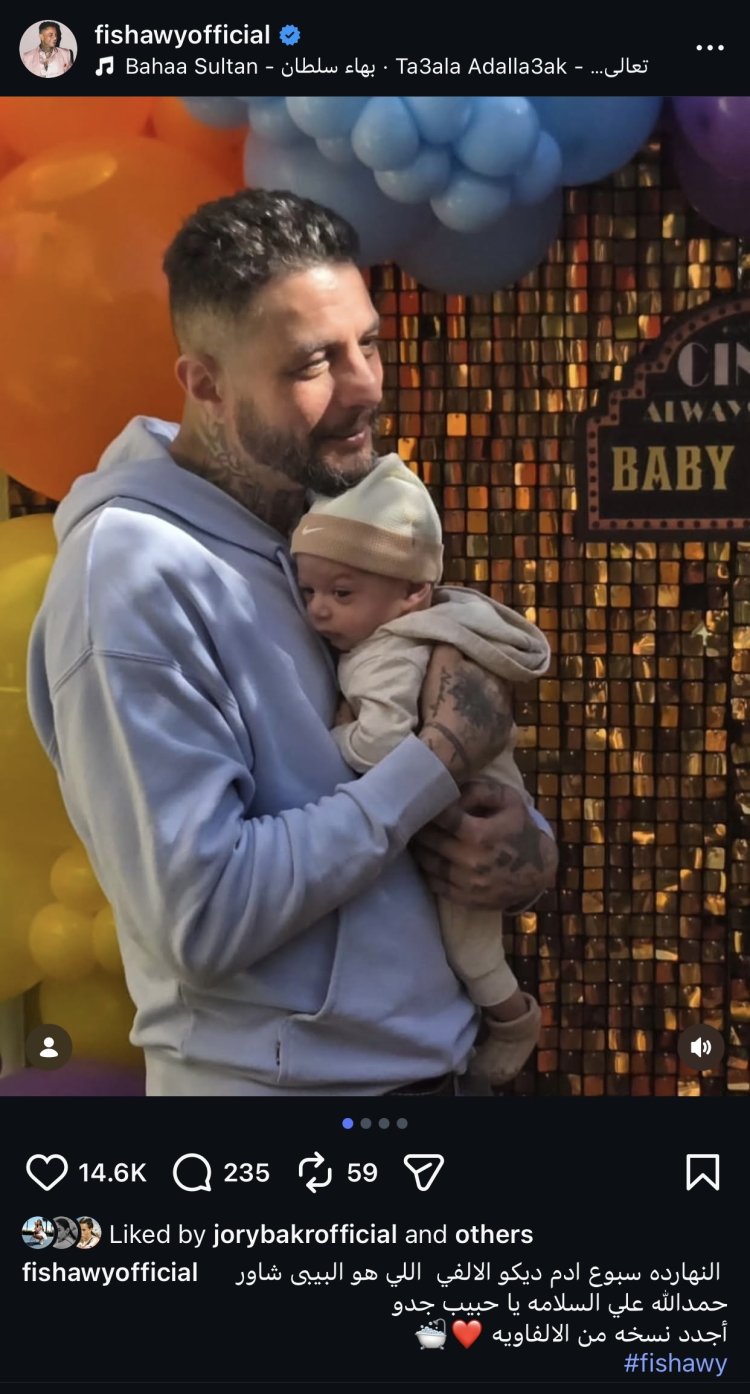 وعلّق الفيشاوي: «النهاردة سبوع آدم ديكو الألفي، اللي هو البيبي شاور.. حمد الله على السلامة يا حبيب جدو».