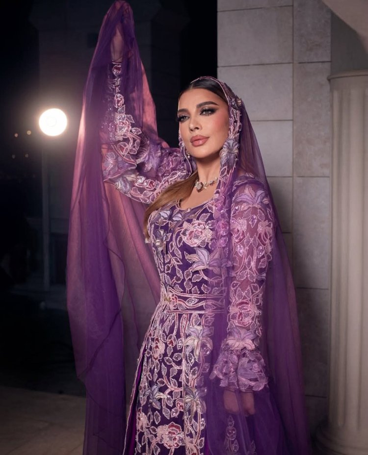خطفت أصالة الأنظار بعباءة صممت خصيصاً باللون البنفسجي الملكي، وهو اللون الذي يرمز تاريخياً للفخامة والتميز. وزاد من وهج الإطلالة اعتمادها البرقع الخليجي بتصميم عصري مرصع بالفصوص اللامعة، في لفتة تقديرية للتراث العربي الأصيل، مقدمةً رؤية بصرية تجمع بين الحشمة والجرأة الفنية المعهودة عنها.