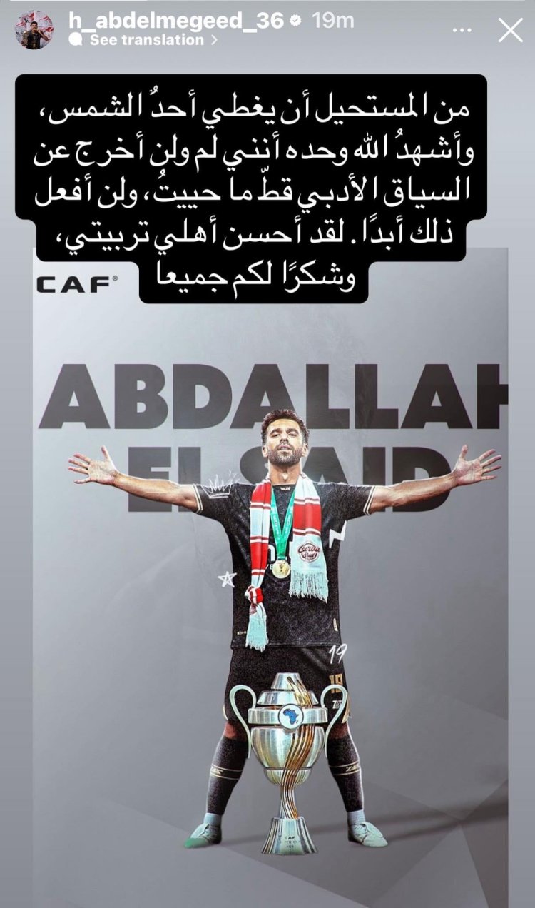 ونشر حسام عبدالمجيد عبر حسابه الرسمي على منصة "إنستجرام" صورة لزميله عبد الله السعيد، مرفقة بتعليق نفى فيه قطعيا أي تجاوز أدبي من جانبه، حيث كتب: "من المستحيل أن يغطي أحد الشمس، وأشهد الله وحده أنني لم ولن أخرج عن السياق الأدبي قط ما حييت، لقد أحسن أهلي تربيتي، وشكراً لكم جميعا".