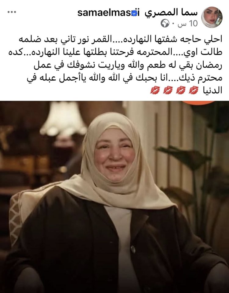 وحرصت سما المصري، على التعبير عن إعجابها الكبير بالظهور الجديد للفنانة القديرة، وكتبت عبر حسابها على “فيسبوك”: «أحلى حاجة شفتها النهارده، القمر نور تاني بعد ضلمة طالت قوي، المحترمة فرحتنا بطلّتها علينا النهارده، كده رمضان بقى له طعم والله، وياريت نشوفك في عمل محترم زيك، أنا بحبك في الله والله يا أجمل عبلة في الدنيا».