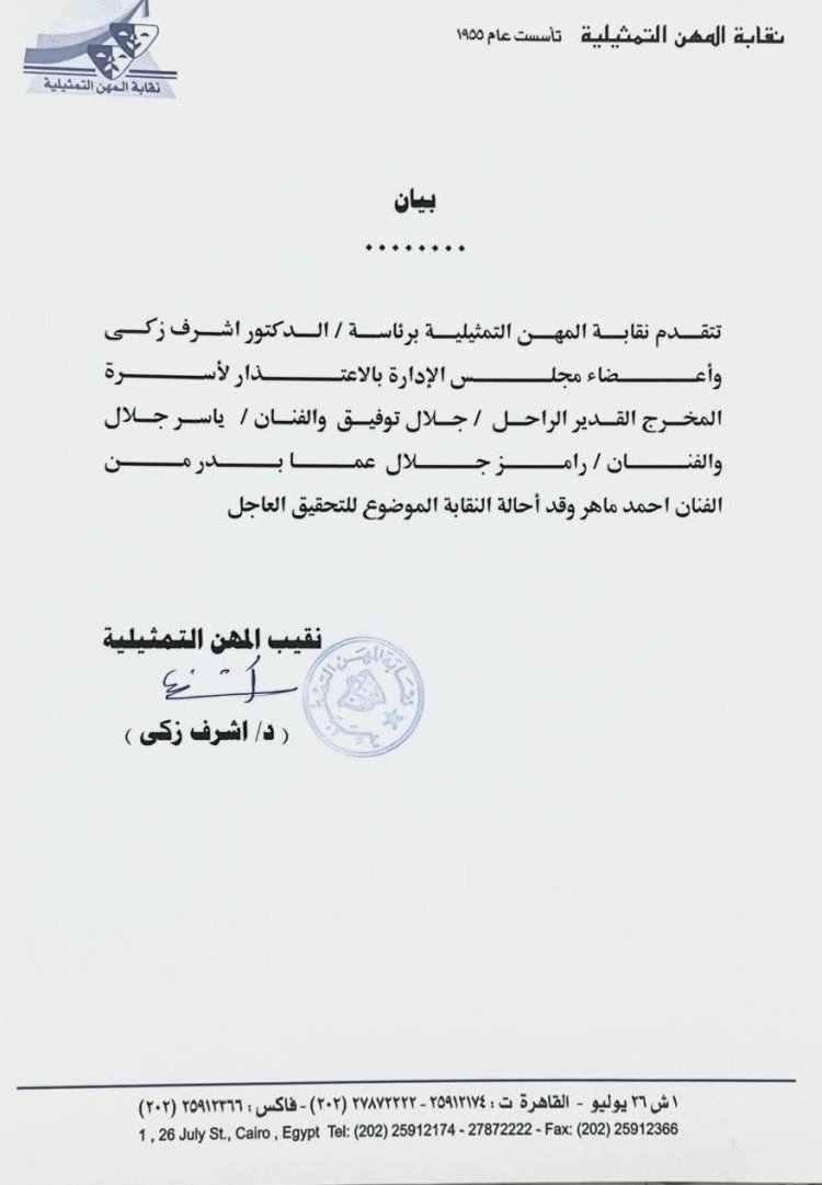 في تحرك رسمي سريع، أصدرت نقابة المهن التمثيلية، برئاسة الدكتور أشرف زكي، بياناً رسمياً تتقدم فيه بخالص الاعتذار لأسرة المخرج القدير الراحل جلال توفيق، وللنجمين ياسر جلال ورامز جلال.