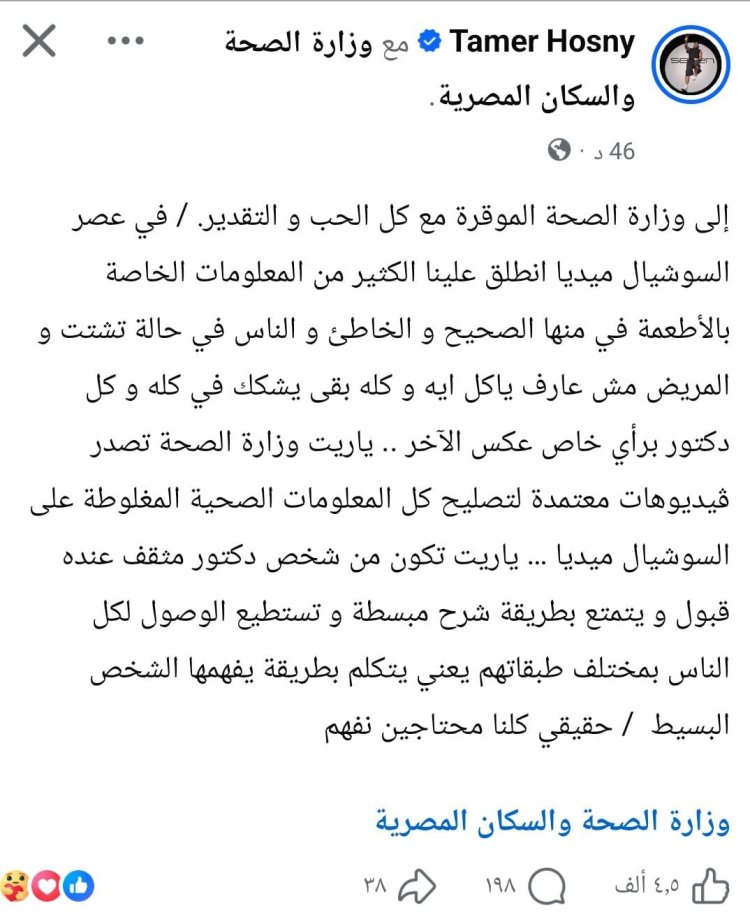 ناشد الفنان تامر حسني وزارة الصحة المصرية عبر حسابه الرسمي على موقع فيسبوك، بضرورة التحرك لإصدار مقاطع فيديو توعوية مبسطة تهدف إلى تصحيح المعلومات الصحية المغلوطة المنتشرة على منصات التواصل الاجتماعي.