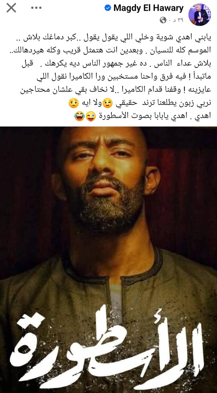 فرق الهواري في رسالته بين من يتحدث من خلف الكاميرا ومن يقف أمامها، مشيراً إلى أن الممثل الحقيقي يحتاج إلى كسب ود المشاهد (الزبون) ليصنع "ترند حقيقي" نابع من موهبته وليس من افتعال الأزمات.